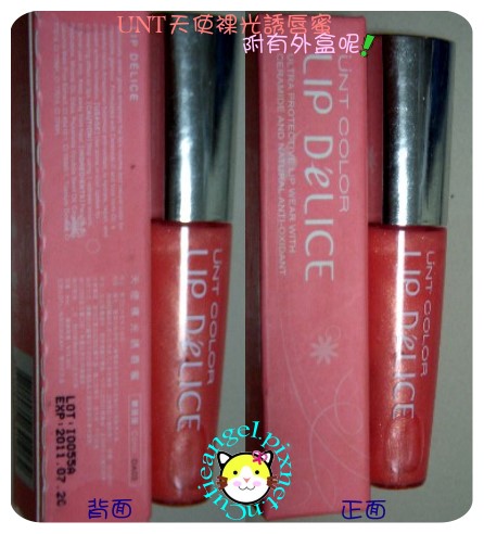 乍看UNT天使裸光誘唇蜜(嫩珊瑚)包裝時,質感絲毫不輸專櫃外盒包裝呢!因為之前曾獲得試用Maybelline水果凍唇蜜,但卻無外盒,所以收到UNT天使裸光誘唇蜜之前一度以為其無外盒,沒想到不但附有外盒,而且包裝質感頗佳呢