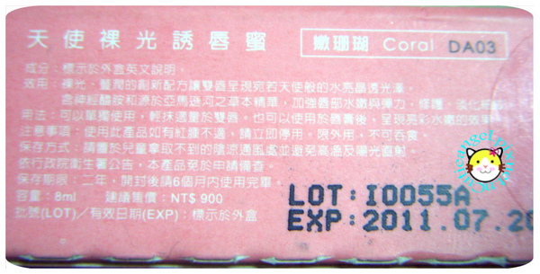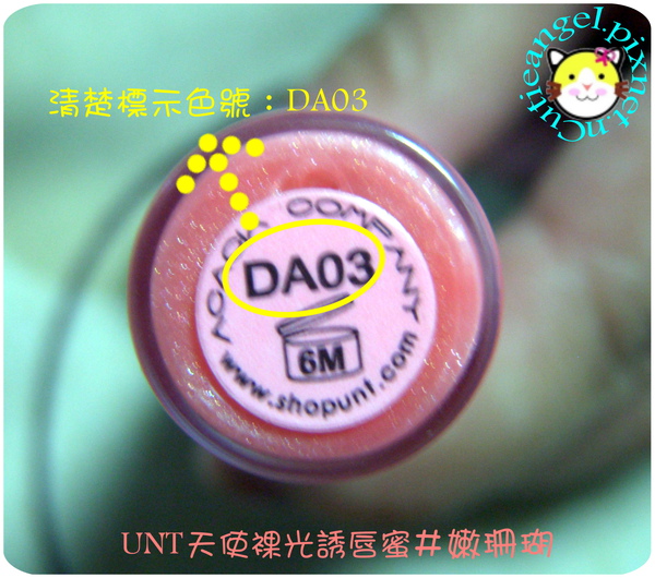 翻到UNT天使裸光誘唇蜜底部,清楚標示色號-DA03(嫩珊瑚),但令我驚訝地是底部透明瓶身處,依稀可見唇蜜晶瑩剔透