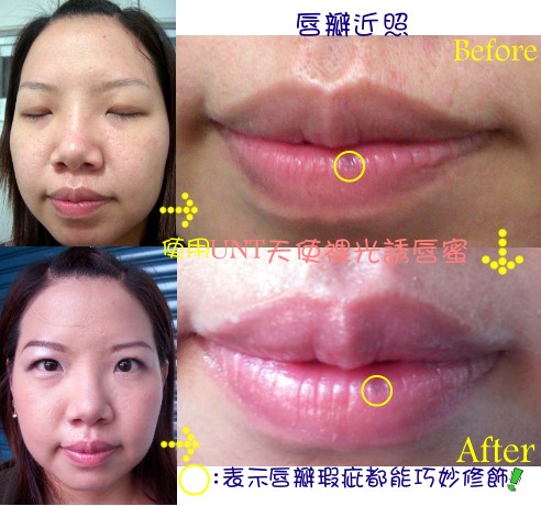 。礙於個人原本唇色黯淡不勻,先以粉色護唇膏修飾原本黯陳唇色,接續使用UNT天使裸光誘唇蜜(嫩珊瑚)疊色,凸顯唇色,修飾唇紋,甚至連唇瓣瑕疵都能巧妙修飾,不禁令我聯想:原來唇蜜也能像遮瑕膏般地妙用無窮呢!真是一款兼具透嫩(嫩珊瑚粉色系裸透自然)、撫紋(輕易撫平唇瓣細紋)、水潤(質地無比水潤)等多功能型唇蜜呢