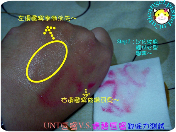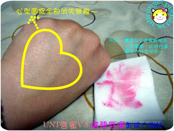 左邊心型圖案為UNT天使裸光誘唇蜜(嫩珊瑚),右邊則為倩碧沁甜光恆久水唇蜜(#9可愛蘋果),用眼唇卸妝液輕灑於心型圖案上,如下圖所示。