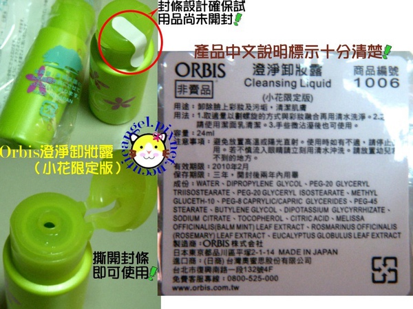 有關Orbis澄淨卸妝露(小花限定版)產品用途、用法、容量、注意事項、有效期限、保存期限、成分、製造商、進口商、免費客服專線及網址如照片所示(盡量拍清楚了,照片仍有些許反光,尚祈見諒